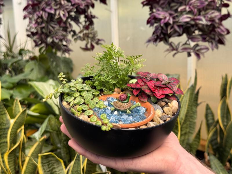 The $10.00 workshop fee includes your planter bowl. soil, gravel, mini gnomes, instruction and three plants.