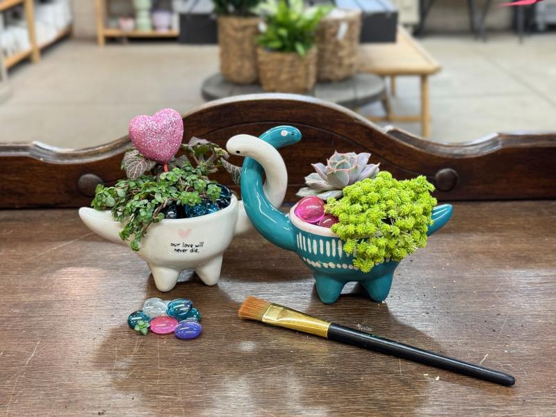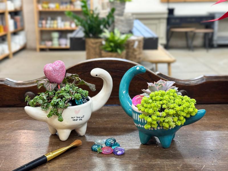 The all-inclusive $36.99 workshop includes two dinosaur planters with intertwined necks, four 2" plants selected with help from our team, soil & decorative accents, and tips on plant care.
